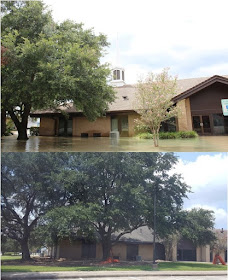 One of our church buildings, in the Villages of Bear Creek area, got flooded, along with the post office across the street. The post office is back in business—as is the library, not far away. But that church is still being worked on. When I drove past today, it still had two large dumpsters out back. We have two congregations from that building that have been sharing space with us for a year. We’re told work should be completed this fall, but I haven’t heard word yet on when.